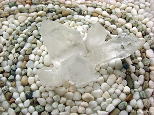 Natural river pebbles, and quartz crystals.